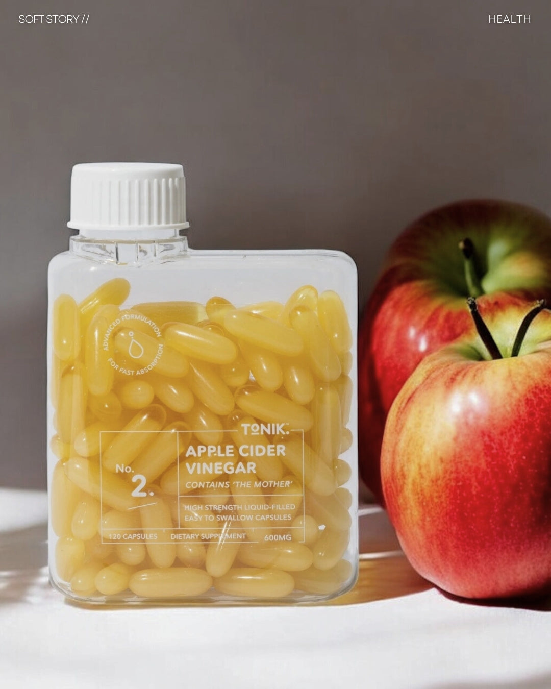 Tonik No.2 蘋果醋膠囊 Apple Cider Vinegar Capsules是世界上第一個也是唯一一個液體填充的有機蘋果醋膠囊,在易於服用和吸收更快的膠囊中提供 6 倍濃度的蘋果醋。每粒膠囊含有 600 毫克純有機蘋果醋,其中含有強大的天然酵母(mother),更保留整體營養。2 粒膠囊 已經等於 30 毫升生蘋果醋。