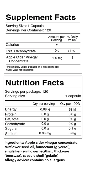 Tonik No.2 蘋果醋膠囊 Apple Cider Vinegar Capsules是世界上第一個也是唯一一個液體填充的有機蘋果醋膠囊,在易於服用和吸收更快的膠囊中提供 6 倍濃度的蘋果醋。每粒膠囊含有 600 毫克純有機蘋果醋,其中含有強大的天然酵母(mother),更保留整體營養。2 粒膠囊 已經等於 30 毫升生蘋果醋。